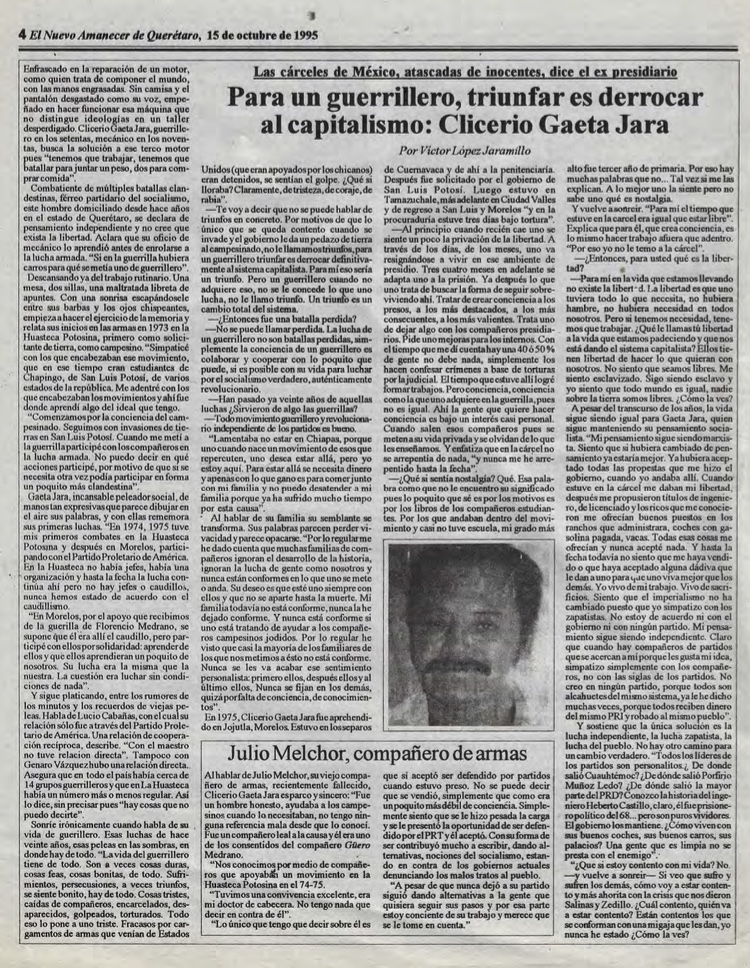 En 1975, Clicerio Gaeta Jara fue aprehendido en Jojutla, Morelos Estuvo en los separos de Cuernavaca y de ahí a la penitenciaría. Después fue solicitado por el gobierno de San Luis Potosí. Luego estuvo en Tamazuchale, más adelante en Ciudad Valles y de regreso a San Luis y Morelos “y en la procuraduría estuve tres días bajo tortura”.