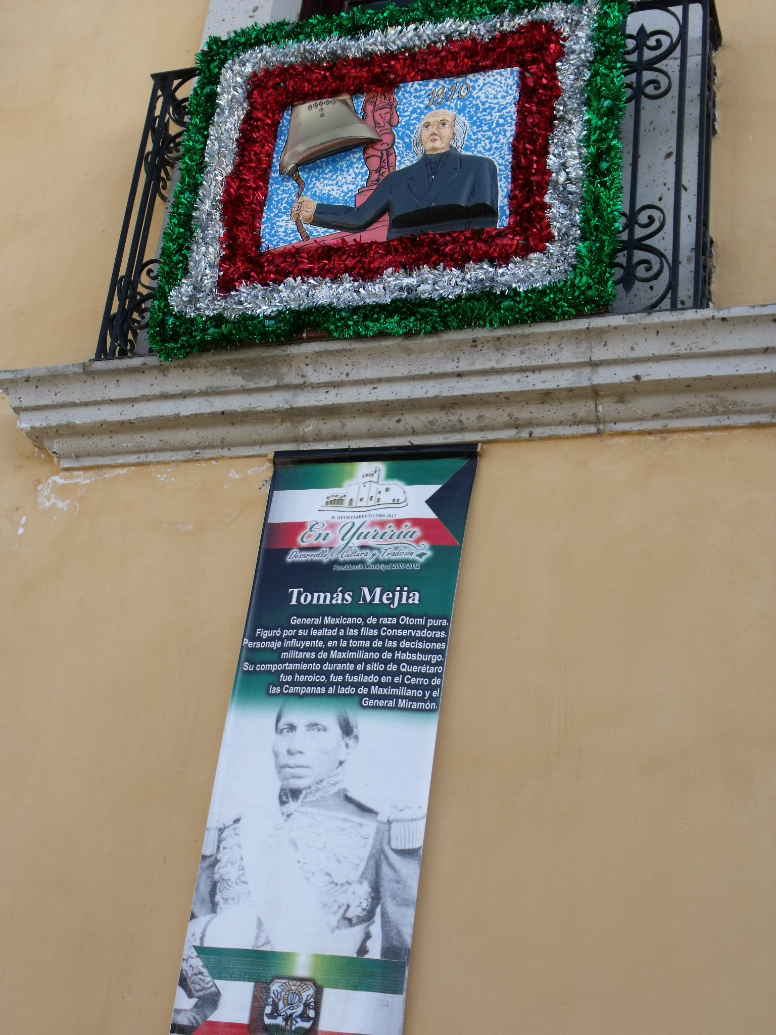 En el texto del pendón, colocado en la parte inferior de una imagen de Miguel Hidalgo, dice: “Tomás Mejía. General Mexicano de raza otomí pura. Figuró por su lealtad a las filas Conservadoras (en altas en el texto original). Personaje influyente en la toma de decisiones militares de Maximiliano de Habsburgo. Su comportamiento durante el sitio de Querétaro fue heroico, fue fusilado en el Cerro de las Campanas al lado de Maximiliano y el General Miramón”.