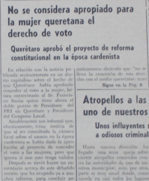 EN 1952, el líder del PRI queretano, Francisco Susán, quien a la vez era diputado local, dijo que era inapropiado que la mujer queretana tuviera derecho al voto. «Nuestras mujeres no son para eso, son para el hogar», declaró entonces a Tribuna, semanario independiente dirigido por Jesús de la Isla, el líder priista.
