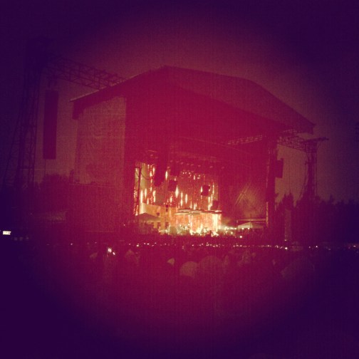 Al filo de las 10 de la noche, las luces se apagaron y se encendieron los cientos de leds del escenario con 11 pantallas (hechas, por cierto, con botellas de plástico reciclado; Radiohead es una banda preocupada por la ecología) y las 50 mil personas congregadas empiezan a gritar.