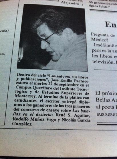 El 27 de septiembre de ese complicado año -¿desde entonces, que año no ha sido complicado para México?- José Emilio Pacheco visitó Querétaro. Invitado por el Tec de Monterrey campus Querétaro, vino a charlar con estudiantes sobre su obra «Las Batallas en el Desierto» y a premiar a los mejores ensayos estudiantiles, entre ellos, el de un joven Rodolfo Muñoz Vega, hoy funcionario del gobierno de José Eduardo Calzada.