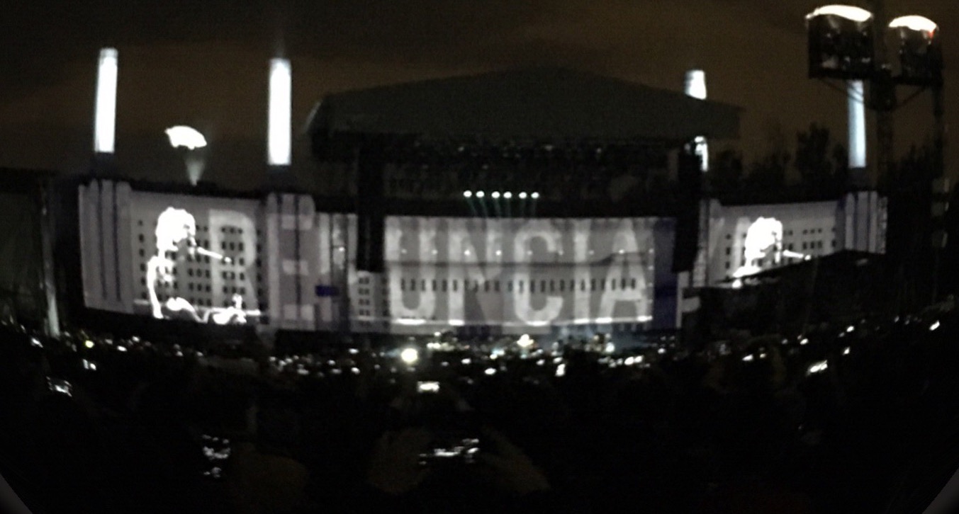 El cuarto acto correspondió a extractos de ‘The Wall’ (1979) y empezamos con ‘Happiest Days of our lifes’ y ‘Another brick in the wall’ para seguir con la demoledora ‘Mother’ y su pregunta sobre si debemos confiar en el gobierno, mientras en la pantalla se veía la frase «Renuncia ya«. Así, el concierto se convirtió en un mitin político y empezaron los gritos de «Fuera Peña, Fuera Peña«.