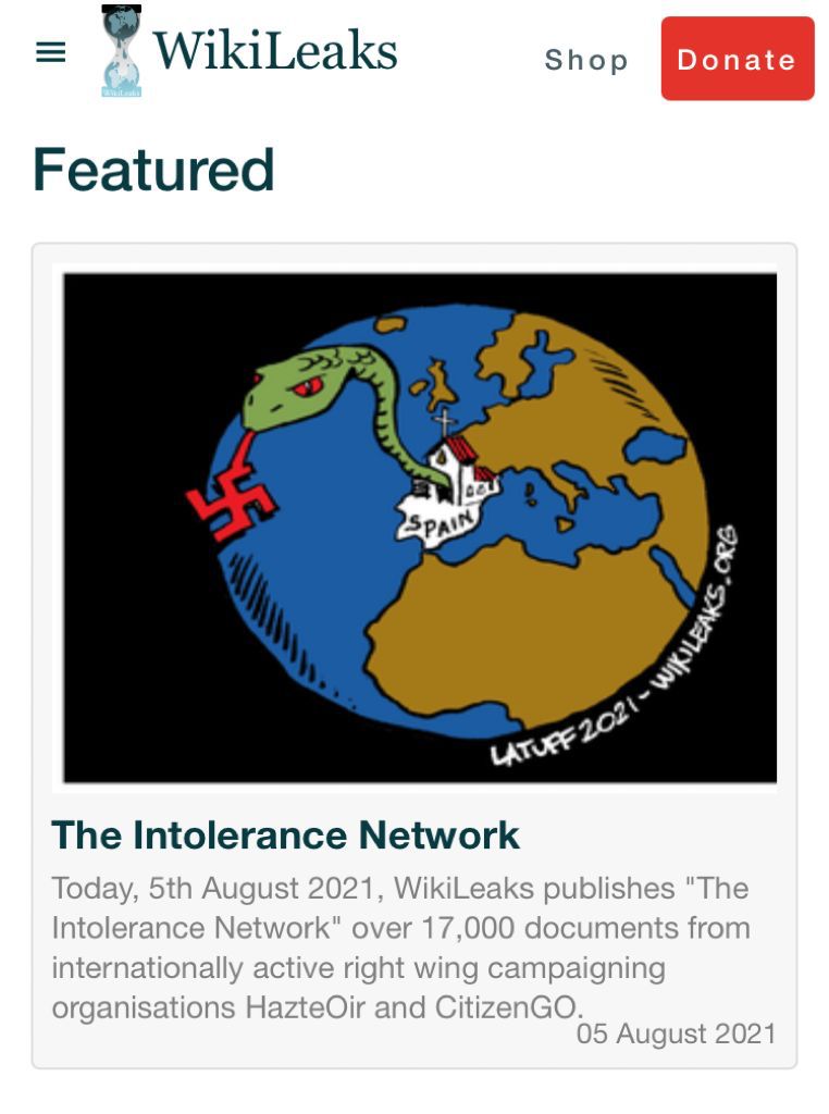 Bajo el título «Red de intolerancia», el 5 de agosto WikiLeaks colgó en su portal más de 17 mil documentos que presentan las conexiones que tienen las organizaciones ultraderechistas españolas HazteOír (HO) y CitizenGO, cuyas ligas llegan hasta México y otros 50 países.